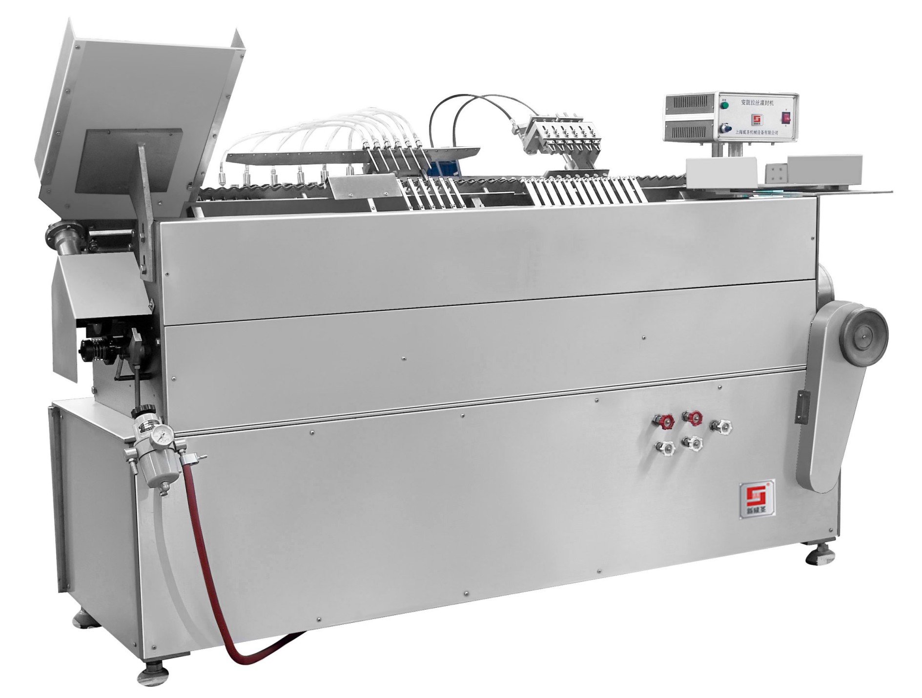 本机是新一代单机多针拉丝灌封机。设计中采用矩形输瓶...